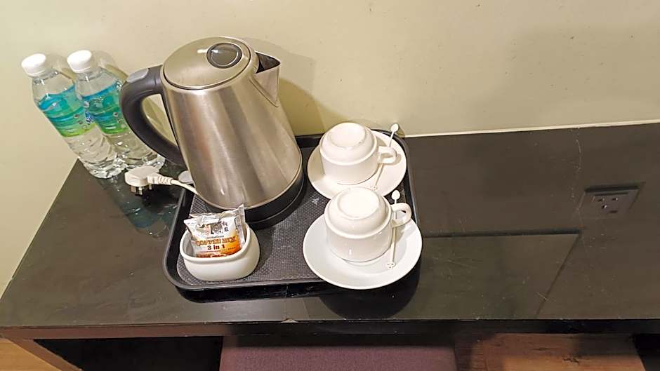 This double room features a electric kettle, air conditioning and tumble dryer .